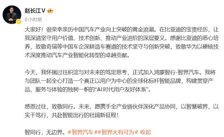 1月13日上午,前比亚迪高管赵长江发文宣布正式加入智界汽车。其微博认证已同步更新为"智界汽车执行董事 及执行副总裁"。这一消息尘埃落定,也为此前持续数月的传闻画上句号。2025年10月24日,赵长江宣布从比 亚迪离职时,就有传闻称其将加入智界,但彼时他对外表示仍在休息中。 赵长江微博 履新后,赵长江接手的首款核心产品即为智界首款MPV车型V9。而这一选择,恰好与他在比亚迪生涯的高光 时刻形成呼应:其在比亚迪任职期间的标志性功绩——腾势D9。这款车型不仅打破了别克GL8对高端MPV市 场的长期垄断,更创下上市仅5个月月销量便突破6000辆的佳绩,连续两年蝉联中国MPV全市场年销量冠军。 另外,从销量数据来看,目前智界品牌主要销量来源为智界R7,但该车型销量走势波动较大,2025年1月销量 超1万辆,到6月一度下滑至3194辆,至12月又回升至9665辆,一年多的时间里经历多次改款;而另一款轿车智 界S7的月销量则长期徘徊在1000辆左右,未能扛起销量大旗。 对于亟需一款旗舰产品稳定增长、夯实高端品牌形象的智界而言,手握MPV成功经验的赵长江,与首款MPV 智界V9的组合,被寄予厚望。但前方并非坦途,如今国内MP ...