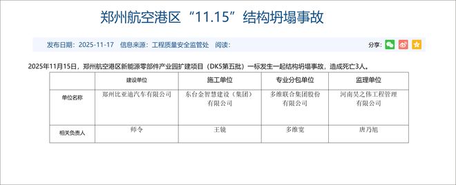 2025年前三季度,河南全省汽车整车产量103万辆、同比增长21%,新能源汽车产量49万辆、同比增长 18.5%,其中比亚迪产量占据全省新能源汽车产量超过七成。 比亚迪郑州工厂 图片转自河南日报 公开资料显示,比亚迪目前已经在郑州落地四期。其中,一期用地4104亩,规划为年产能40万辆的整车 生产线;二期用地3838亩,规划为年产能60万辆的整车生产线;三期用地2500亩,作为动力电池生产基 地;四期用地3100亩,主要规划生产半导体。 据河南省住房和城乡建设厅网站消息,2025年11月15日,郑州航空港区新能源零部件产业园扩建项目 (DK5第五批)一标发生一起结构坍塌事故,造成死亡3人。 相关公告显示,该项目建设单位为郑州比亚迪汽车有限公司,施工单位为东台金智慧建设(集团)有限 公司,专业分包单位为多维联合集团股份有限公司,监理单位为河南昊之伟工程管理有限公司。 | 发布日期:2025-11-17 信息来源:工程质量安全监管处 阅读: | | 郑州航空港区"11.15"结构坍塌事故 | | 分享: 0 / 女 | | --- | --- | --- | --- | --- | | 2025年11月15日,郑 ...