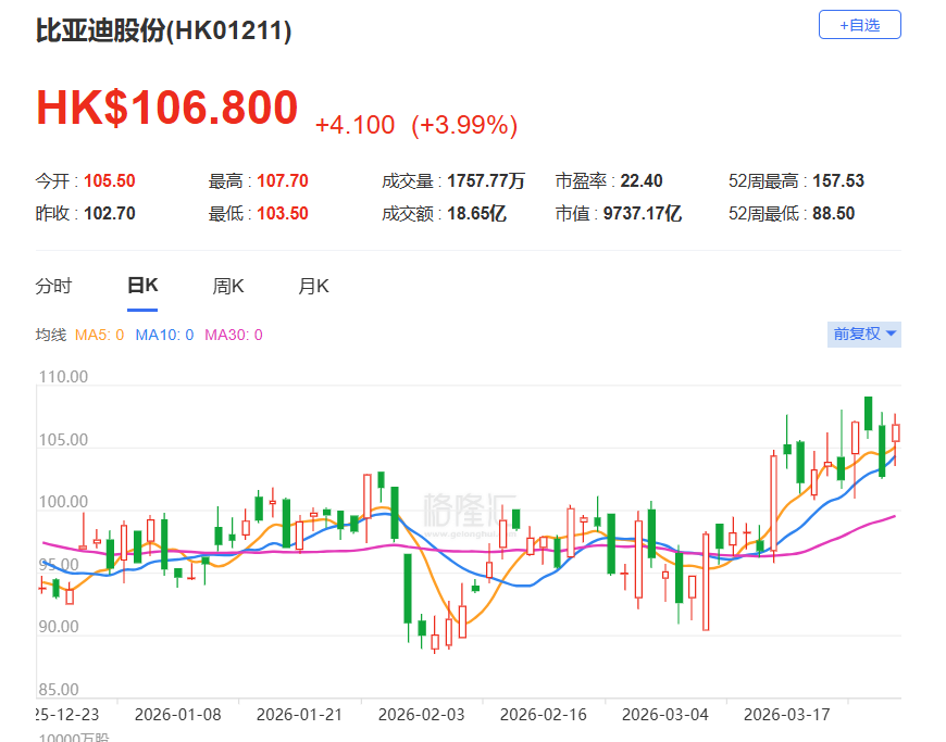 比亚迪股份 比亚迪股份-R 分时图 日K线 周K线 月K线 106.50 3.80 3.70% 4.97% 3.31% 1.66% 0.00% 1.66% 3.31% 4.97% 97.60 99.30 101.00 102.70 104.40 106.10 107.80 09:30 10:30 12:00/13:00 14:00 16:10 0 86万 171万 257万 本集团作为全球新能源汽车行业先行者和领导者,深耕新能源汽车领域,凭藉精準的战略布局、领先的 技术实力、前瞻的市场洞察、完善的产业体系、持续升级的产品力及品牌力,卫冕2025年中国汽车市场 车企、中国汽车市场品牌、全球新能源汽车市场销量"三冠王",并历史性登顶全球纯电动汽车市场销量 榜首,彰显出强大的市场主导力。 比亚迪(002594)股份(01211)发布截至2025年12月31日止年度业绩,该集团取得营业额人民币8039.65 亿元(单位下同),同比增加3.46%;母公司拥有人应占溢利326.19亿元,同比减少18.97%;基本每股收益 3.58元,拟每10股派发现金股息39.74元,每10股送红股8股及资本公积金每10股转增12股。 ...