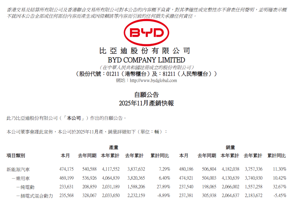 注:本公司 2025 年 11 月出口新能源汽车合计 131,935 辆; 本公司 2025 年 11 月新能源汽车动力电池及储能电池装机总量约为 27.669 GWh,2025 年累计装机总量约为 258.282 GWh。 务请注意,上述产、销量数字未经审核,亦未经本公司审计师确认,或会予以调整并有待最终确认。本公司刊发财务业绩后,股东及 潜在投资者务必详阅。 单位:辆 产量 销量 项目类别 本月 去年同期 本年累计 去年累计 累计同比 本月 去年同期 本年累计 去年累计 累计同比 新能源汽车 474,175 540,588 4,117,552 3,837,632 7.29% 480,186 506,804 4,182,038 3,757,336 11.30% -乘用车 469,199 536,926 4,064,839 3,820,365 6.40% 474,921 504,003 4,130,639 3,740,930 10.42% -纯电动 233,631 208,859 2,031,189 1,588,206 27.89% 237,540 198,065 2,066,002 1,557,258 32 ...