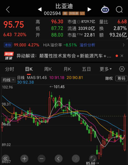 ◀ < 96.30 市值⊙8729.7亿 量比 6.68 高 95.75 87.72 流通 3339.0亿 换 2.87% lee 6.43 7.20% 88.00 市盈T™ 22.81 额 93.26亿 开 港股 99.000 4.27% H/A 溢价率 -8.51% 溢价分析 > 键 异动解读:颠覆性技术发布会 + 新能源汽车 + ... ● × 分时 均线 ▼ 日线 MA5:91.45 10:91.18 20:90.81 除权 | 筹码 30:92.38 ←101.45 102.96 98.31 89.02 85.88 比亚迪 < 002594 ■ 深通 L1 96.30 市值⊙8729.7亿 量比 6.68 got 95.75 87.72 流通 3339.0亿 换 2.87% 但 88.00 市盈T™ 22.81 额 93.26亿 6.43 7.20% 开 港股] 99.000 4.27% H/A 溢价率 -8.51% 溢价分析 > ™ 异动解读:颠覆性技术发布会 + 新能源汽车 + ... ● × 分时 均线 - 日线 MA5:91.45 10:91.18 20:90.81 除权 | 筹码 30:9 ...