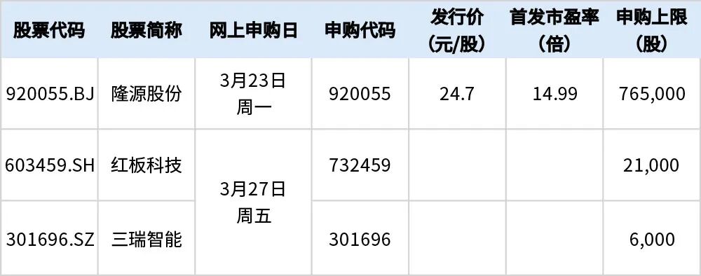 展望:下周新股基本面一览 据目前安排,若无变化,下周(3月23日至27日)有3只新股可申购,分别为创业板1只、沪市主板1只和北交所1只。 近期,北交所新股表现持续活跃。本周,2只北交所新股的上市首日平均涨幅为273.61%。 机构提示称,受海外局势影响,近期避险情绪升温,新股次新板块再度呈现剧烈震荡;但值得注意的是,局部新股标的近期也同时出现较为强势的阶段性 活跃,新股次新板块结构性亮点或依然凸显;建议在控制风险前提下、继续适度寻找可能的结构性机会。 根据目前安排,下周将有3只新股可申购。拟于下周一(3月23日)申购的隆源股份是汽车精密铸件"小巨人",形成了"全球知名汽车零部件供应商+整车制 造厂商"的客户结构。公司与主要客户均已建立长期稳定的合作关系,产品广泛应用于全球知名汽车品牌,包括福特、通用、特斯拉、蔚来、零跑、小 米、比亚迪、吉利、广汽、雷诺、大众、奥迪、长安、长城、现代、丰田、宝马、奔驰和奇瑞等。 拟于下周五(3月27日)申购的红板科技专注于印制电路板的研发、生产和销售,公司在手机HDI主板的产品覆盖度和市场占有率均处于行业前列。公司 是全球前十大智能手机品牌中8家品牌的主要手机HDI主板供应商, ...