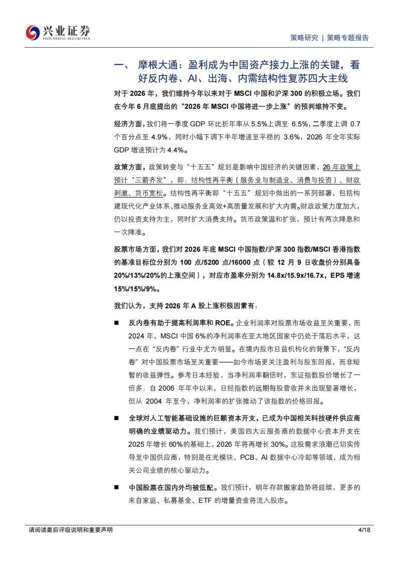 关于报告的所有内容,请于公众『市场分析报告』阅读原文 《十大外资对2026年A股的建议》 兴业证券分析师梳理整合了包括摩根大通、高盛、瑞银等在内的十家国际主流机构对2026年A股的年度展望,旨在呈现外资视角下对中国资产的结构性共识 与配置逻辑,很有参考价值。 一、摩根大通 即将进入2026年,A股市场的变化趋势已逐渐清晰。以摩根大通为代表的外资机构认为,上市公司能否实现实实在在的"盈利",将成为推动中国资产上涨的 核心动力。市场的关注点正从前期估值的普遍修复,转向企业业绩的兑现能力。 该机构预测,2026年沪深300指数有望达到5200点,这意味着相较于2025年12月的收盘价,存在约13%的上涨空间。对应的市场平均估值约为15.9倍市盈 率,而上市公司整体的每股收益(EPS)预计将增长15%。这一轮盈利复苏具有广泛基础,调查显示,超过三分之一的细分行业已经进入收入增长区间,盈 利前景得到上调的公司数量比例创下2020年以来的新高。 摩根大通将投资机会归纳为四条清晰的主线:抑制过度竞争(反内卷)、人工智能(AI)、全球化拓展(出海)以及国内需求的局部复苏。 抑制过度竞争(反内卷):政策正直接对"低价倾销"等行 ...