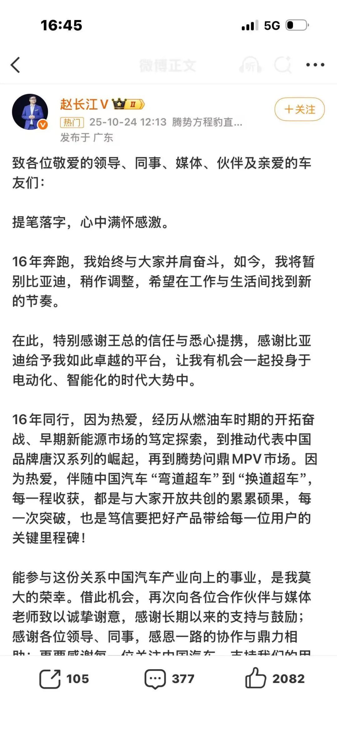 比亚迪现人事变动:16年"老将"、原腾势销售事业部总经理、腾势方程豹直营事业部总经理赵长江离职。对于赵长江的后续去向,网传他将加入智界汽 车,但目前这一消息未获证实。 10月24日,赵长江在社交媒体发文,宣布将离开比亚迪。 "感恩王总(比亚迪董事长王传福)与公司的包容栽培。现今暂别,希望在工作与生活间找到新的节奏。"赵长江在社交媒体发文称。 公开资料显示,赵长江2009年大学毕业后即入职比亚迪,从普通销售经理做起,一步步成长为比亚迪京津地区营销总监,2017年,31岁的他成为比亚迪最 年轻的销售公司总经理。 2022年,当比亚迪和奔驰决定重启腾势品牌时,他被委以重任,出任腾势销售公司总经理,主导完成了该品牌的渠道建设、市场营销等工作,并打造了高 端新能源MPV腾势D9这一爆款车型,打破了别克GL8在MPV市场上的垄断地位。作为比亚迪集团冲击高端化的三大品牌之一,腾势还推出了N7、N8、 Z9、N9等多款旗舰产品。 今年7月,根据比亚迪公司轮岗制度,原腾势销售事业部总经理赵长江与腾势方程豹直营事业部总经理李慧进行了岗位对调。 彼时,赵长江曾在社交媒体发文回顾了他在接手腾势汽车后腾势品牌的发展,同时表示接下来将在 ...