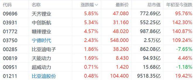 格隆汇10月24日|港股锂矿股集体上涨,其中,天齐锂业、中创新航涨超5%,赣锋锂业涨超4%,宁德 时代涨超2%,比亚迪电子、天能动力涨超1%。 来源:格隆汇APP | 代码 | 名称 | 涨跌幅 √ | 最新价 | 总市值 | 年初至今涨跌 | | --- | --- | --- | --- | --- | --- | | 096960 | 天齐锂业 | 5.85% | 47.080 | 772.69亿 | 95.76% | | 03931 | 中创新航 | 5.34% | 31.160 | 552.25 亿 | 142.30% | | 01772 | 赣锋锂业 | 4.57% | 48.020 | 987.86 Z | 140.87% | | 03750 | 宁德时代 | 2.43% | 548.000 | 2.5万亿 | 109.24% | | 00285 | 比亚迪电子 | 1.86% | 38.260 | 862.08亿 | -7.65% | | 00819 | 天能动力 | 1.69% | 8.430 | 94.93亿 | 4.46% | | 00951 | 铝威动力 | 0.71% | 1.420 ...