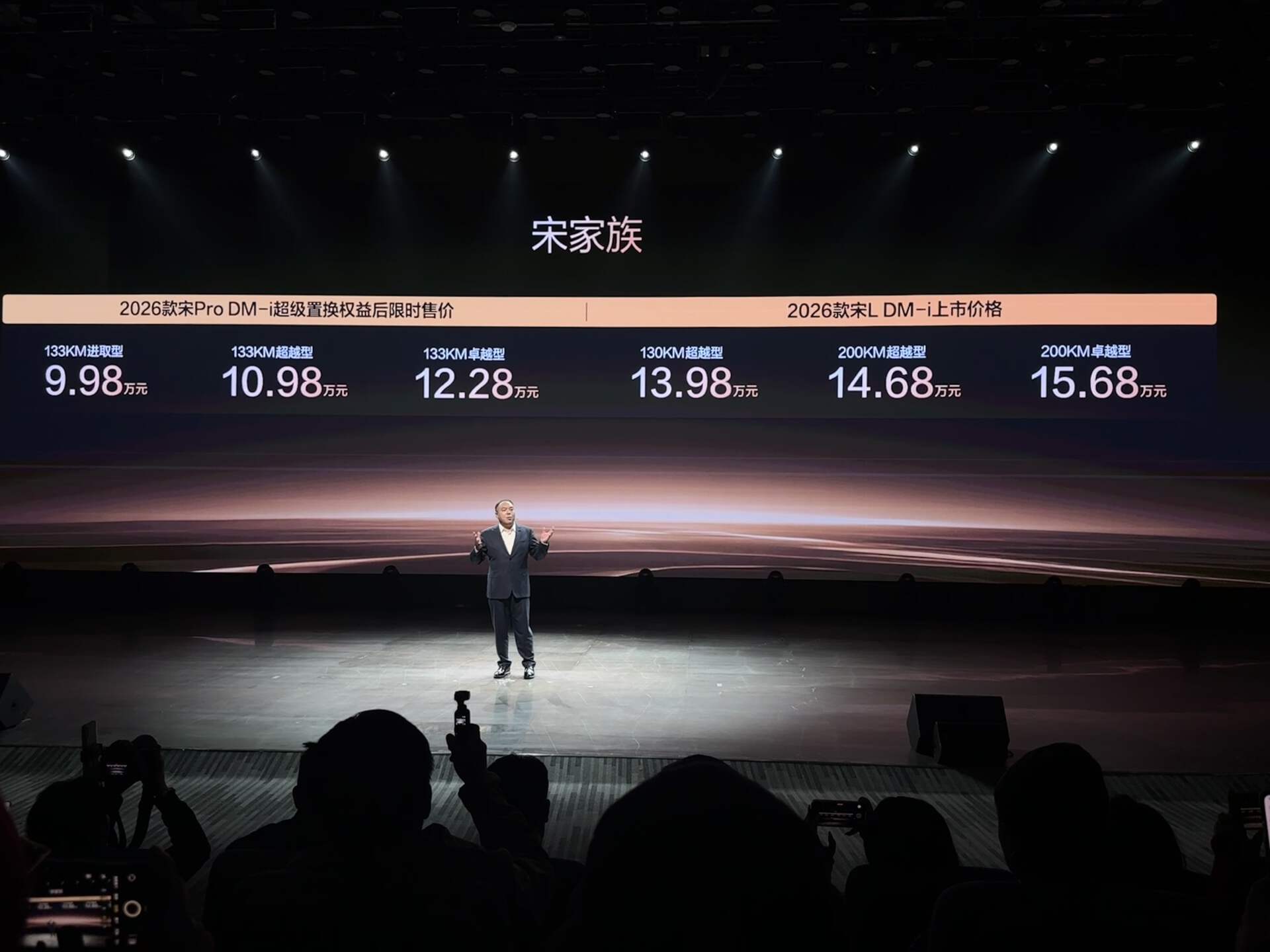 来源:环球网 10月23日,比亚迪宋家族迎来重磅焕新,2026款宋L DM-i/宋Pro DM-i双车同步上市,限时售价9.98- 15.68万元起。 其中,2026款宋L DM-i售价13.98-15.68万元,2026款宋Pro DM-i超级置换权益后,限时售价9.98-12.28 万元。同时,两款车型均带来了丰厚的上市权益礼。 作为比亚迪SUV产品线的绝对顶流,宋家族至今已陪伴用户走过整整十年,累计销量超380万辆。宋家 族持续聚焦用户核心需求,此次焕新纯电续航增加、亏电油耗再创新低。 2026款宋L DM-i纯电续航高达200km,百公里亏电油耗低至3.4升。全系标配云辇-C智能阻尼车身控制 系统、TBC高速爆胎稳行系统、天神之眼C驾驶辅助系统,新增一体式冷暖冰箱、座椅按摩,新增两款 全新车色,换装电子怀挡,打造中级SUV豪华标杆。 2026款宋Pro DM-i油耗创全球SUV最低记录,百公里亏电油耗3.2升,纯电续航提升至133km。升级多连 杆独立悬架,新增一款全新车色,换装电子怀挡,是年轻家庭第一台SUV首选。 2026款宋L DM-i:纯电续航200公里!插混也能当纯电开 2026款宋L DM ...