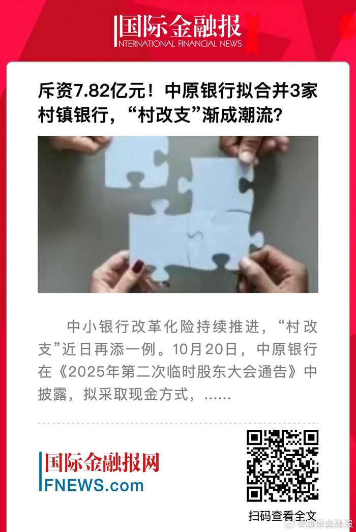 中小银行改革化险持续推进,"村改 支"近日再添一例。10月20日,中原银行 在《2025年第二次临时股东大会通告》中 披露,拟采取现金方式, ..... 国际金融报网 FNEWS.com 扫码查看全不露咖 斥资7.82亿元! 中原银行拟合并3家 村镇银行,"村改支"渐成潮流? 【斥资7.82亿元!中原银行拟合并3家村镇银行,"村改支"渐成潮流?】 的金融服 ...