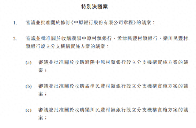 中原银行发布的该次股东大会的通函显示,在收购股权数量方面,中原银行拟收购濮阳中原村镇银行、 孟津民丰村镇银行、栾川民丰村镇银行的其他股东分别持有的0.29亿股、0.98亿股、1.06亿股股权,其 交易价格分别拟定为1.33元/股、2.99元/股、4.25元/股(具体交易对价以经主管财政部门备案后的评估 结果为准)。 10月20日,中原银行发布了2025年第二次临时股东大会通告。通告显示,该行拟以现金收购濮阳中原村 镇银行、孟津民丰村镇银行、栾川民丰村镇银行三家村镇银行,并将其改建为中原银行的分支机构。 如果以此价格计算,则中原银行此次收购三家银行的价格分别为0.38亿元、2.93亿元、4.51亿元,合计 金额将超7.8亿元。 然而,观察者网注意到,今年上半年中原银行的盈利表现并不突出。根据其2025年中期报告数据,今年 上半年该行实现营收135.63亿元,同比下滑3.1%;实现归属该行股东净利润20.34亿元,同比下滑 0.8%。此外,中原银行截至今年上半年的资产不良率为2.01%,较年初下滑了0.01个百分点。 近期,中原银行还迎来了新任行长。10月17日,中原银行发布公告称,因工作调整,刘凯不再担任行长 ...