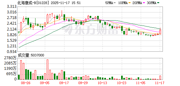 Core Viewpoint - Beihai Kangcheng-B (01228.HK) experienced a significant intraday increase of nearly 18%, with a current rise of 11.76%, trading at HKD 2.09, and a transaction volume of HKD 10.2188 million [2] Summary by Category - **Stock Performance** - The stock price of Beihai Kangcheng-B rose by 11.76% to HKD 2.09 [2] - The intraday increase reached nearly 18% at one point [2] - The trading volume was recorded at HKD 10.2188 million [2]