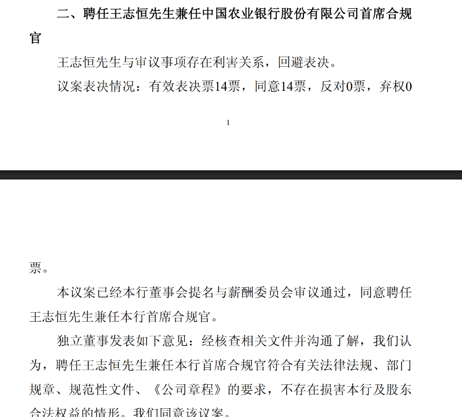 21世纪经济报道记者张欣 2026年开春,农业银行与中国银行相继发布公告,分别由行长王志恒、张辉兼任本行首席合规官。此次系两家银行首次设立首 席合规官职位,且均由总行行长亲自兼任,被业内认为"高配",反映出国有大行对合规内控的重视。 此番高层人事调整,是2024年12月国家金融监督管理总局《金融机构合规管理办法》政策要求下的实质性落地。《合规办法》 明确要求,金融机构应当在机构总部设立首席合规官,且首席合规官应为高级管理人员,并允许行长(总经理)或其他高级管 理人员兼任。该办法自2025年3月1日起正式施行,给予行业一年过渡期。 随着《办法》所设过渡期临近尾声,从国有大行、股份制银行到地方城商行、农商行,各类银行业金融机构正迎来首席合规官 的集中聘任与任命潮。 2025年12月,就有多家银行完成相关人事任命。例如,兴业银行聘任副行长孙雄鹏为首席合规官,平安银行也聘任行长助理吴 雷鸣兼任该职,江阴农商行则由行长倪庆华兼任。去年11月,宁波银行也聘任副行长王勇杰为首席合规官,常熟银行也宣布由 新任行长陆鼎昌兼任这一职务;2026年2月11日晚间,光大银行亦公告称,聘请杨文化为该行副行长兼首席合规官。 (图源:农行 ...