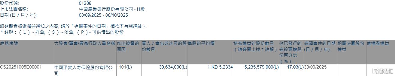 | 表格序號 | 大股東/董事/最高行政人員名稱 作出披露的 買入 / 費出或涉及的股 每股的平均價 | | 持有權益的股份數目 佔已發行的 有關事件的B | | | --- | --- | --- | --- | --- | | | 原因 份數目 | | ( 請參閱上述 * 註解 ) 有投票權股 (日 / 月 / 年 | | | | | | 份自分比 | | | | | | ( % | | | CS20251005E00001 | 中国平安人寿保险股份有限公 1101(L) | 39.634.000(L) | HKD 5.2334 5,235,579,000(L) | 17.03(L)30/09/2025 | | | 0 | | | | | 股份代號: | 01288 | | --- | --- | | 上市法國名稱: | 中國農業銀行股份有限公司 - H股 | | 日期 (日 / 月 / 年): | 08/09/2025 - 08/10/2025 | 格隆汇10月8日丨根据联交所最新权益披露资料显示,2025年9月30日,农业银行(01288.HK)获中国平安人寿保险股份有限公司在场内以每股均价5.233 ...