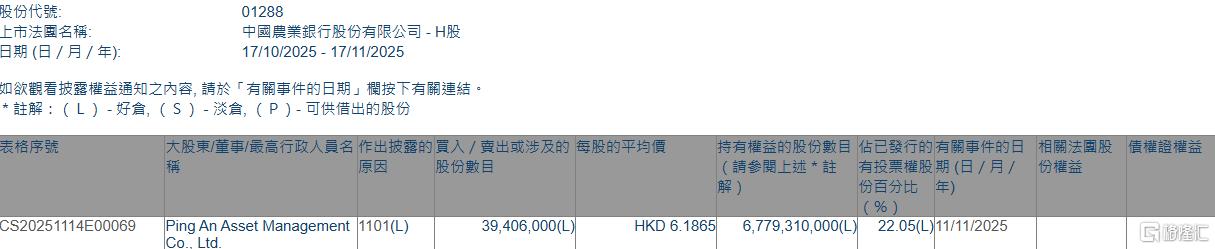 Core Viewpoint - Ping An Asset Management Co., Ltd. has increased its stake in Agricultural Bank of China (01288.HK) by acquiring 39.406 million shares at an average price of HKD 6.1865 per share, raising its ownership percentage from 21.92% to 22.05% [1]. Group 1 - Ping An Asset Management Co., Ltd. purchased 39.406 million shares of Agricultural Bank of China on November 11, 2025, for approximately HKD 244 million [1]. - Following the acquisition, Ping An Asset Management's total shareholding in Agricultural Bank of China reached 6,779,310,000 shares [1]. - The increase in ownership percentage reflects a strategic investment decision by Ping An Asset Management, moving from 21.92% to 22.05% [1].