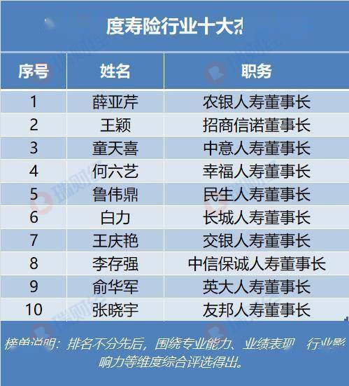 | 度寿险行业十大烈 | | | | --- | --- | --- | | 序号 | 姓名 | 职务 | | 1 | 醇亚芹 | 农银人寿董事长 | | 2 | 王颖 | 招商信诺章事长 | | 3 | 童天喜 | 中意人寿董事长 | | 4 | 何六艺 | 幸福人寿青事长 | | 5 | 鲁伟鼎 | 民生人寿董事长 | | 6 | 白力 | 长城人寿节事长 | | 7 | 王庆艳 | 交银人寿节事长 | | 8 | 李存强 | 中信保诚人寿董事长 | | 9 | 前华军 | 英大人寿董事长 | | 10 | 《张宇 | 友邦人寿青事长 | | 榜单尚明:排名不分先后,围绕专业能力、业绩表现 行业层 | | | | 响力等维度综合评选得出。 | | | 2025年,张晓宇带领公司实现净利稳步增长,成立独立资管公司,实现资产端与负债端高效协同,提升 资金管理能力。 "2025年度寿险行业十大杰出人物"榜单围绕专业能力、业绩表现、行业影响力等维度综合评选得出。 张晓宇,男,1976年出生,复旦大学并获得应用数学系硕士学位,拥有北美精算师资格认证。于2000年 加入友邦保险,2025年3月起任友邦人寿董事长。曾先 ...