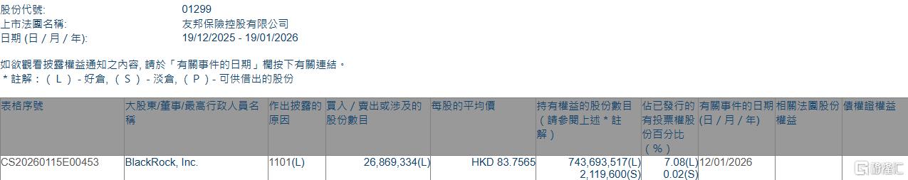 | 股份代號: | 01299 | | --- | --- | | 上市法國名稱: | 友邦保險控股有限 | | 日期 (日 / 月 / 年): | 19/12/2025 - 19/01 | | 一般的一 | 大股東/董事/最高行政人員名 作出披露的 買入 / 賣出或涉及的 每股的平均價 | | | | 持有權益的股份數目 佔已發行的 有關事件的日期 相 | | | --- | --- | --- | --- | --- | --- | --- | | | 股份數目 | | | | (請參閱上述*註 | 有投票權股 (日 / 月 / 年) 材 | | | | | | | | 偷自分市 | | CS20260115E00453 | BlackRock, Inc. | 1101(L) | 26,869,334(L) | HKD 83.7565 | 743,693,517(L) | 7.08(L)12/01/2026 | | | | | | | 2.119.600(S) | 0.02(S) | 格隆汇1月19日丨根据联交所最新权益披露资料显示,2026年1月12日,友邦保险(01299.HK)获BlackRock, ...