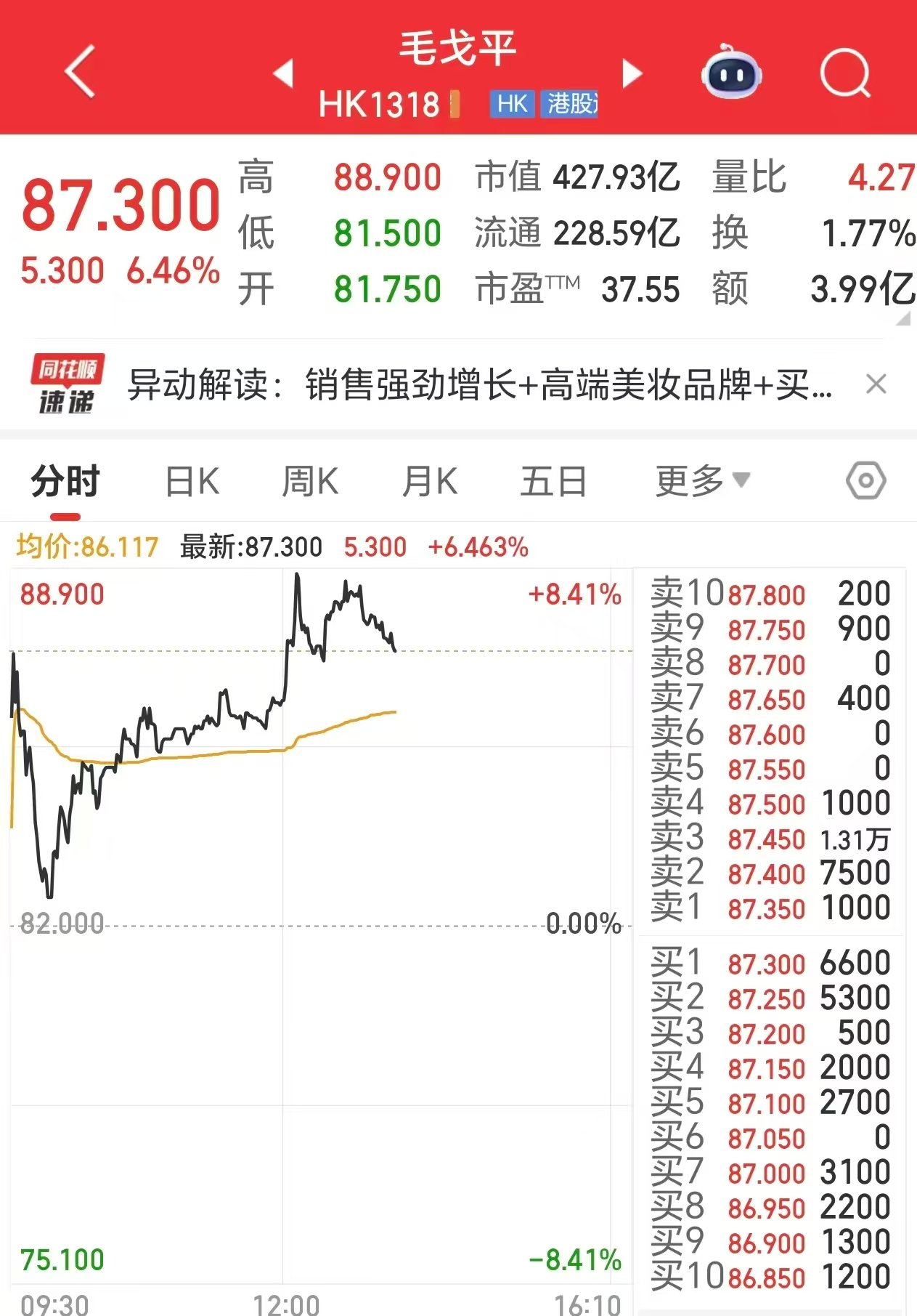 深度拆解:透明化披露+克制性减持+稀缺性份额 公告显示,毛戈平及其一致行动人计划通过大宗交易方式减持不超过1720万股H股,约占总股本的 3.51%。 透明化披露:毛戈平在港股市场罕见地主动提前披露减持计划,充分保障投资者知情权,助力市场理性 决策,彰显对市场与投资者的尊重。减持用途明确指向美妆产业链投资及个人财务改善,公开透明的沟 通方式有效消解了市场对创始人"离场"的疑虑,本质是为公司长远扩张蓄力。 昨日,港股"美妆第一股"毛戈平(01318.HK)发布大股东减持公告引发市场关注。与常规减持引发的股价 重挫不同,毛戈平股价走出"反向行情",机构投资者依旧表现踊跃。此次减持凸显透明、克制、稀缺三 大核心特质,彰显公司发展底气。 盘面扫描:股价上演强势"V"型反转 1月6日,毛戈平(01318.HK)并未受减持公告拖累。早盘低开0.3%后即获大量买盘涌入,股价迅速拉升, 盘中一度上涨8.29%。 业内人士分析:"减持披露后首个交易日不跌反涨,是港股典型'利空出尽'信号。体现市场以真金白银 认可公司基本面及此次减持性质。" 市场传闻:机构"哄抢"稀缺筹码,现有股东或加仓 优质标的减持常被视为"大户调仓"良机。毛 ...