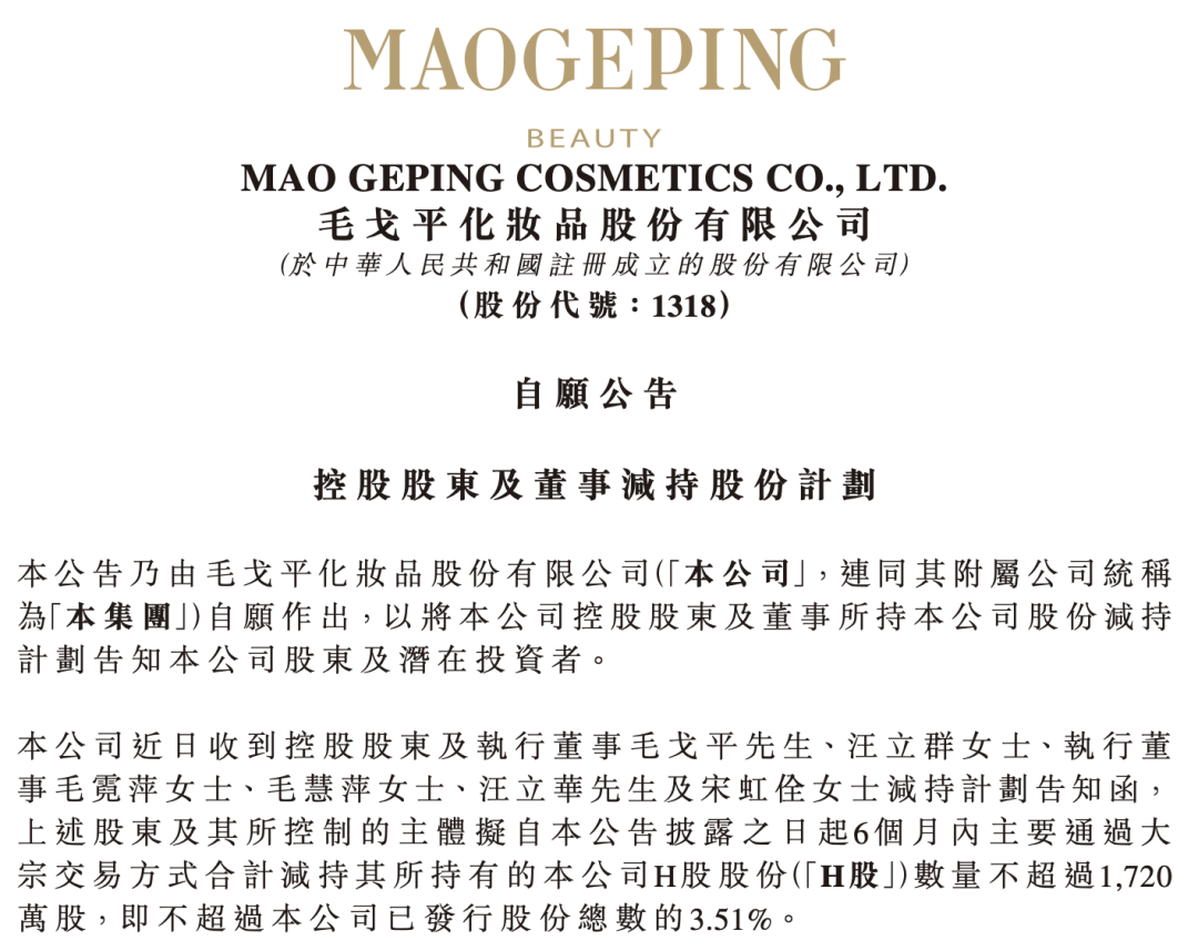 2024年底,毛戈平以29.80港元/股的发行价登陆港交所,香港公开发售部分获超919倍超额认购,成为年度"冻资王",上市首日股价高开近60%。 1月6日晚间,毛戈平化妆品股份有限公司(HK01318,以下简称毛戈平公司)发布减持公告。公司控股股东及执行董事毛戈平、汪立群(毛戈平配偶)、 执行董事毛霓萍(毛戈平姐姐)、毛慧萍(毛戈平姐姐)、汪立华(汪立群弟弟)及宋虹佺基于自身财务需求,拟在减持预披露公告发布之日起6个月 内,主要通过大宗交易方式合计减持其所持有的公司H股股份数量不超过1720万股,即不超过公司已发行股份总数的3.51%。公告称,股东系因自身财务 需求拟减持其所持有的部分股份,减持所得款用途包括但限于美妆相关产业链的投资、改善个人生活等。 2026年1月7日,毛戈平公司的股票以81.75港元/股开盘,盘中涨超5%。即便按照80港元/股计算,1720万股也价值13.76亿港元,折合人民币超12亿元。 财报显示,2025年上半年毛戈平实现营收25.88亿元,同比增长31.3%;实现净利润6.7亿元,同比增长36.1%;整体毛利率为84.2%,较2024年同期轻微下 滑。尽管收入仍保持增长,但与202 ...