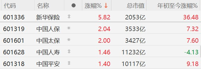 | 代码 | 名称 | . | 涨幅% ↓ | 总市值 | 年初至今涨幅% | | --- | --- | --- | --- | --- | --- | | 601336 | 新华保险 | 1 | 5.82 | 2053亿 | 36.48 | | 601319 | 中国人保 | 婆 | 2.04 | 3533亿 | 7.32 | | 601601 | 中国太保 | 家 | 2.00 | 3427亿 | 7.60 | | 601628 | 中国人寿 | 1 | 1.46 | 11232亿 | -4.13 | | 601318 | 中国平安 | 1 | 1.40 | 10117亿 | 9.18 | 格隆汇10月14日|A股市场保险股集体上涨,其中,新华保险涨近6%,中国人保、中国太保涨超2%, 中国人寿、中国平安涨超1%。 消息面上,新华保险昨晚公告,预计2025年前三季度归属于母公司股东的净利润为299.86亿元至341.22 亿元,同比增长45%至65%。业绩增长主要因公司深化改革发展,提升保险业务价值与经营质量,推进 分红险转型,同时优化资产配置,投资收益在去年同期高基数上继续大幅增长。 ...
