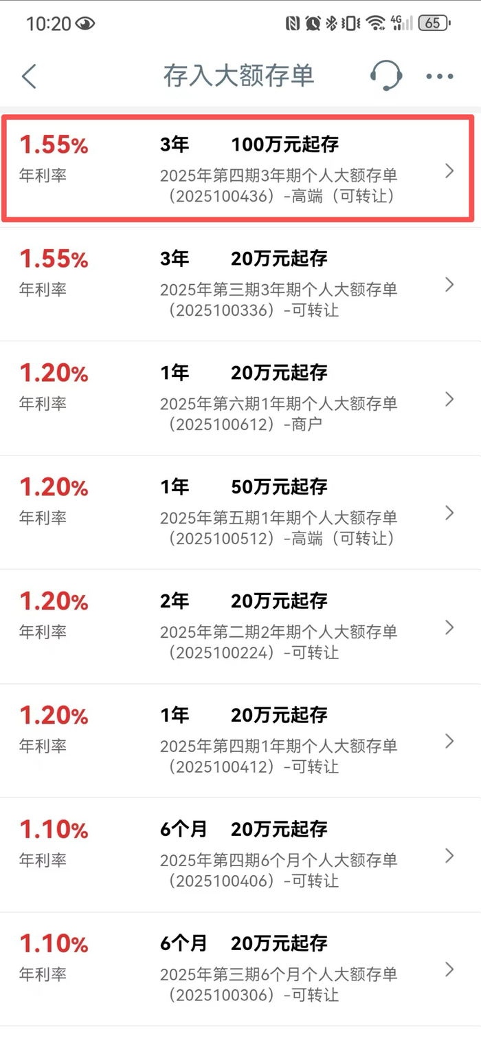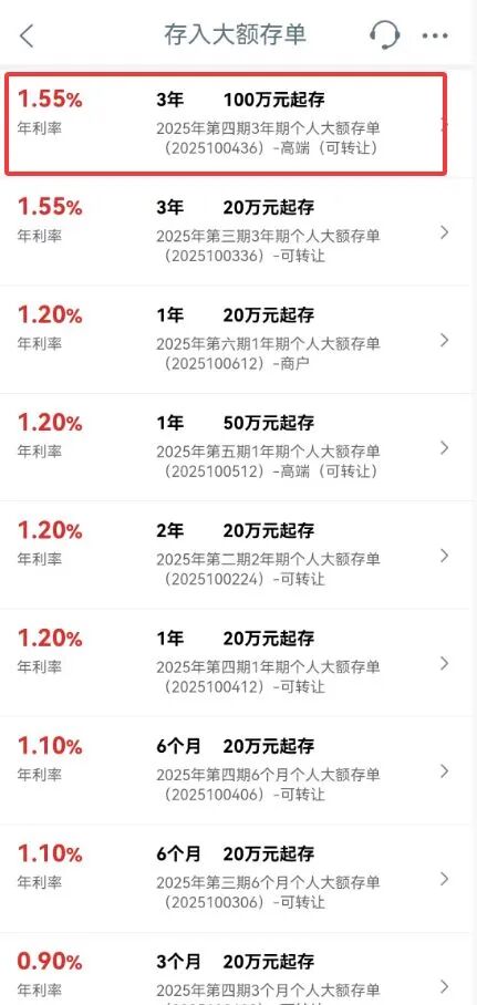 每经编辑|陈柯名 杜宇 12月3日,据工商银行APP显示,该行正在发售的2025年第四期3年期个人大额存单,起步门槛标注为"100万元起存",而年利率仅为1.55%。而最新的工行 三年期定存产品的年利率,标注为"年利率最高可至1.55%",而定存的起步门槛仅为50元。 | | 存入大额存单 | | | --- | --- | --- | | 1.55% | 3年 100万元起存 | | | 年利率 | 2025年第四期3年期个人大额存单 | | | | (2025100436) -高端(可转让) | | | 1.55% | 3年 20万元起存 | | | 年利率 | 2025年第三期3年期个人大额存单 | > | | | (2025100336) -可转让 | | | 1.20% | 1年 20万元起存 | | | 年利率 | 2025年第六期1年期个人大额存单 | > | | | (2025100612) -商户 | | | 1.20% | 1年 50万元起存 | | | 年利率 | 2025年第五期1年期个人大额存单 | > | | | (2025100512) -高端(可转让) | | | 1.20% ...