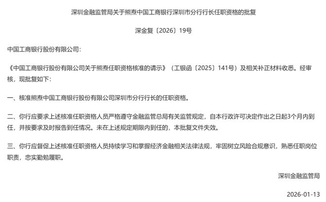2026年1月14日,苏州金融监管分局发布批复称,《中国工商银行苏州分行关于杨青任职资格审核的请 示》(工银苏州报〔2025〕121号)收悉。经审核,现批复如下: 一、核准杨青中国工商银行股份有限公司昆山分行副行长的任职资格。 二、中国工商银行昆山分行应要求上述核准任职资格人员严格遵守金融监管总局有关监管规定,自中国 工商银行昆山分行政许可决定作出之日起3个月内到任并向苏州金融监管分局报告。未在上述规定期限 内到任的,本批复文件失效,由苏州金融监管分局办理行政许可注销手续。 三、中国工商银行昆山分行应督促上述核准任职资格人员持续学习和掌握经济金融相关法律法规,牢固 树立风险合规意识,熟悉任职岗位职责,忠实勤勉履职。 ...