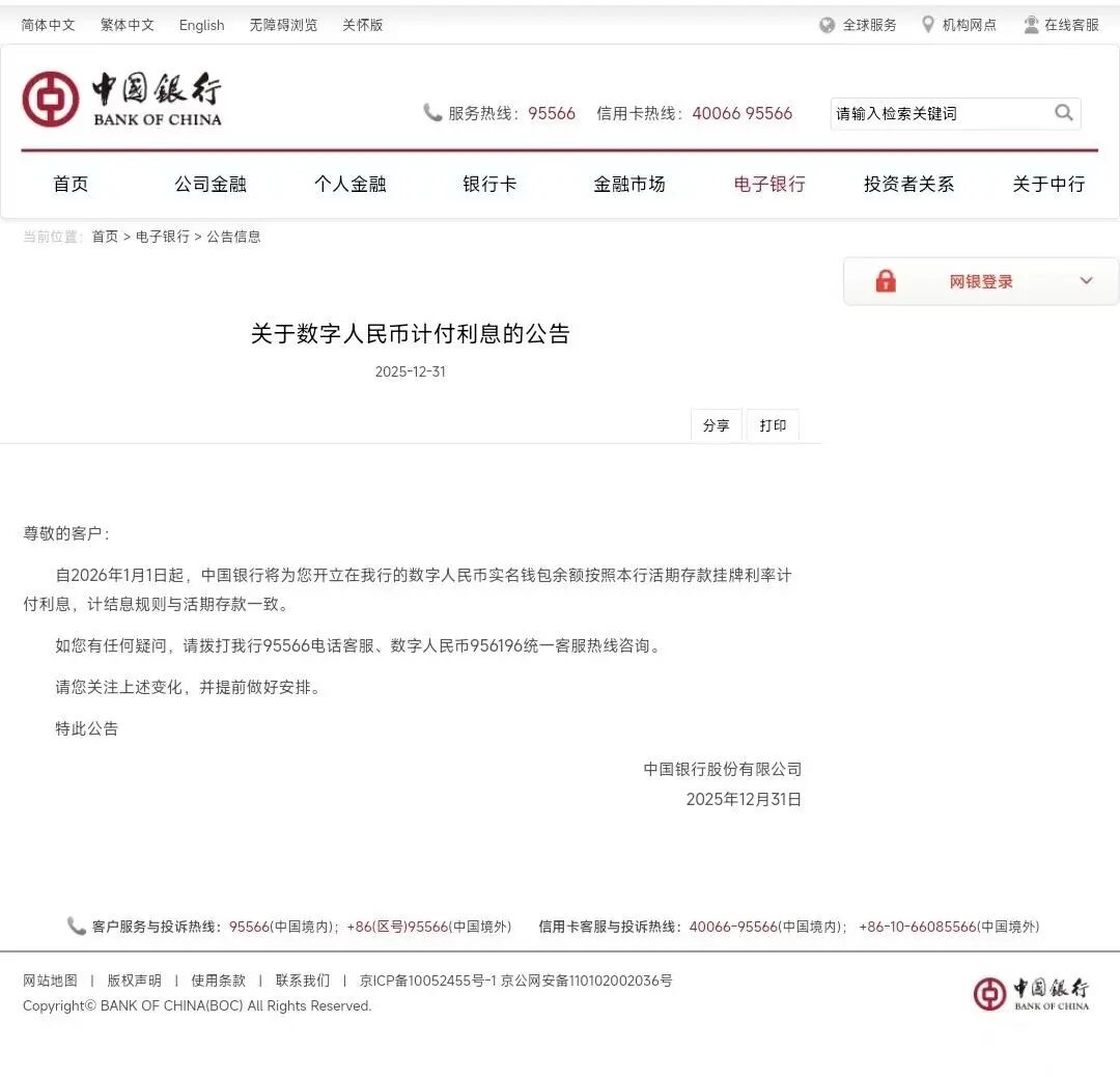 每经记者|张寿林 每经编辑|程鹏 张益铭 明天起,数字人民币实名钱包余额将开始计息。 12月31日,中国银行、工商银行、农业银行、建设银行、交通银行、邮储银行六家国有大行相继发布公告称,2026年1月1日起,将为开立在该行的数字人 民币实名钱包余额按照该行活期存款挂牌利率计付利息,计结息规则与活期存款一致。 重要公告 关于数字人民币计付利息的公告 尊敬的客户: 自2026年1月1日起,中国工商银行将为您开立在我行的数字人民币实名钱包余额按照本行活期存款挂牌利率计付利息,计结息规则 与活期存款一致。 如您有任何疑问,请拨打我行95588电话客服、数字人民币956196统一容服热线咨询。 感谢您长期以来对我行数字人民币业务的关心和支持! 中国工商银行股份有限公司 2025年12月31日 【关闭窗口】 关于数字人民币计付利息的公告 尊敬的客户: 自2026年1月1日起,中国农业银行将为您开立在我行的数字人民币变名钱包余额按照本行活期存款挂牌利率计付利息,计结 息规则与活期存款一致。 如您有任何疑问,请拨打我行95599客服电话,或者数字人民币956196统一客服热线咨询。 感谢您长期以来对我行数字人民币业务的关心和 ...