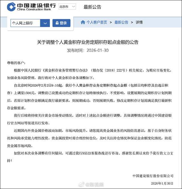 工商银行发布关于调整如意金积存业务及部分品牌实物黄金产品销售业务办理规则并修订如意金积存业务协议的公告。 自2026年2月7日 起,在周末以及法定节假日等非上海黄金交易所交易日,工商银行将对如意金积存业务进行限额管理, 限额类型包括全量或单一客户单日 积存/赎回上限、单笔积存或赎回总量上限等,并进行动态设置,提金不受影响。 工行、建行今日相继发布公告,对个人黄金积存业务的相关规则进行调整。 建设银行发布关于调整个人黄金积存业务定期积存起点金额的公告, 自北京时间2026年2月2日9:10起,建设银行个人黄金积存业务定期积 存起点金额(包括日均积存及自选日积存)上调至1500元。 调整前已设置成功的定期积存计划将继续执行,不受影响。设置展期的定期积 存计划到期后,若原计划积存金额满足建设银行最新要求,则展期成功,否则展期失败。修改定期积存计划需满足建设银行最新积存金额要 求。后续将持续关注黄金市场变动情况,适时对上述起点金额进行调整。 ...