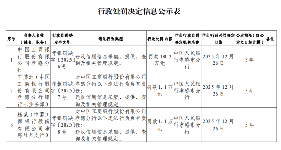 责任编辑:秦艺 | 库费 | 当事人名称 | 行政处罚决 | 题法行为类型 | 行政处罚内塞 | | 作启行政处罚 作出行政处罚决定 公示期限(自公 | | 备注 | | --- | --- | --- | --- | --- | --- | --- | --- | --- | | | (姓名、职务) | 定书文号 | | | 决定机关名称 | 日期 | 家之日超计算) | | | | 中国工商银 | | 行 图 全 网 来 孝银罚决 行 股 份 有 限字 C 2025 违反信用信息采集、提供、查 罚款 10.2 公 司 孝 感 分字 L 2025 [询及相关管理规定。 | | 中国人民银 | 26 日 | 3 के | | | | | | | | 行孝感市分 | 2025年12月 | | | | | 行 | 6 号 | | | 行 | | | | | | 王某洲(中国 | | 对中国工商银行股份有限公司 | | | | | | | 2 | 工 商 银 行 股 孝银罚决 孝感分行以下违法行为负有责 罚款 1 1 万 国人民银 份 有限 公 司字〔 2025 ]任: | | | | | 2025年12月 26 ...