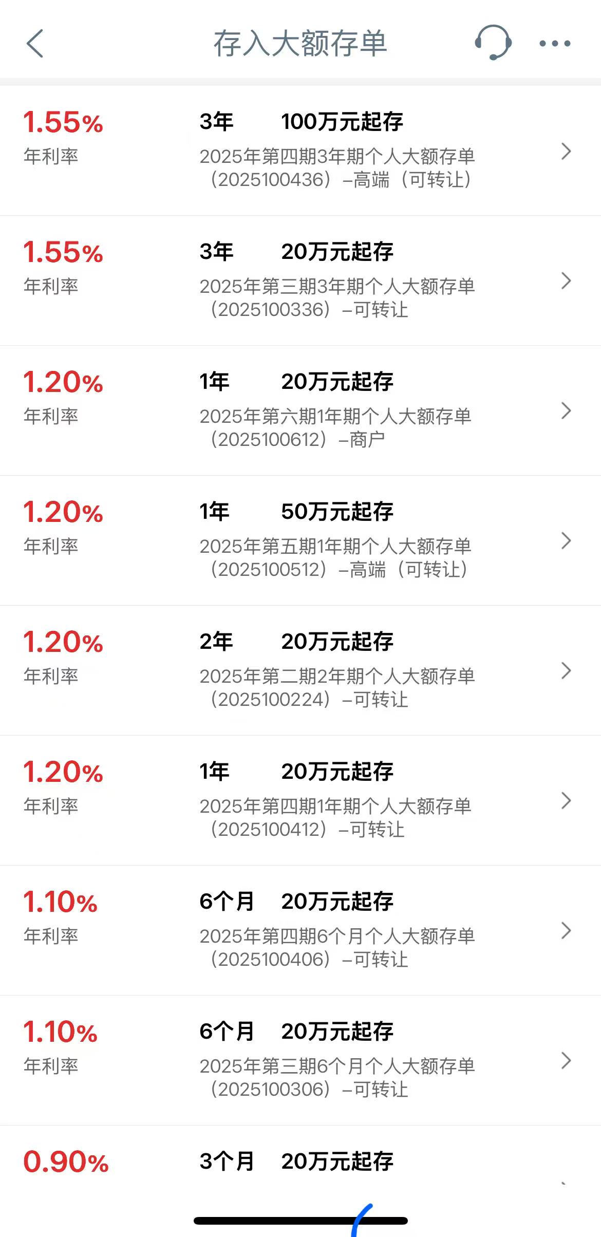 12月2日晚间,财联社记者登陆工商银行APP发现,该行正在发售的2025年第四期3年期个人大额存单,起步门槛标注为"100万起存",而年利率仅为 1.55%。 而最新的工行三年期定存产品的年利率,标注为"年利率最高可至1.55%",而定存的起步门槛仅为50元。 财联社查询及采访了解到,当前市场上各家银行大额存单起步门槛基本为20万元。 1.20% 年利率 2025年第二期2年期个人大额存单 (2025100224) -可转让 2年 20万元起存 1.20% 年利率 20万元起存 1年 2025年第四期1年期个人大额存单 (2025100412) -可转让 1.10% 年利率 6个月 20万元起存 1.10% 年利率 6个月 20万元起存 2025年第三期6个月个人大额存单 (2025100306) -可转让 下载财联社APP获取更多资讯 准确 快速 权威 专业 7x24h电报 头条新闻 VIP资讯 实时盯盘 2025年第四期6个月个人大额存单 (2025100406) -可转让 ...
