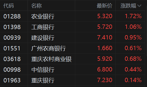 消息上,国泰海通研报指出, 受资金风格切换影响,自7月10日以来,银行指数累计跌幅达到14%,明 显跑输沪深300(累计涨幅15%)、创业板指(累计涨幅42%)。当前视角来看,银行中期分红时间临 近、银行业绩确定性较高,若年底市场风格趋于均衡,银行板块或有补涨机会。 从基本面展望,银行业绩波动较小,利润基本保持平稳正增长,25H1上市银行利润增速达0.8%,全年 来看,业绩有望保持稳中向好的趋势。从边际变化的角度来看,银行息差的同比降幅有望持续收窄,利 好业绩表现。 | 代码 | 名称 | 最新价 | 涨跌幅 √ | | --- | --- | --- | --- | | 01288 | 农业银行 | 5.320 | 1.72% | | 01398 | 工商银行 | 5.720 | 1.06% | | 00939 | 建设银行 | 7.410 | 0.95% | | 01551 | 广州农商银行 | 1.660 | 0.61% | | 03618 | 重庆农村商业银 | 5.920 | 0.68% | | 00998 | 中信银行 | 6.800 | 0.44% | | 01963 | 重庆银行 | 7.23 ...