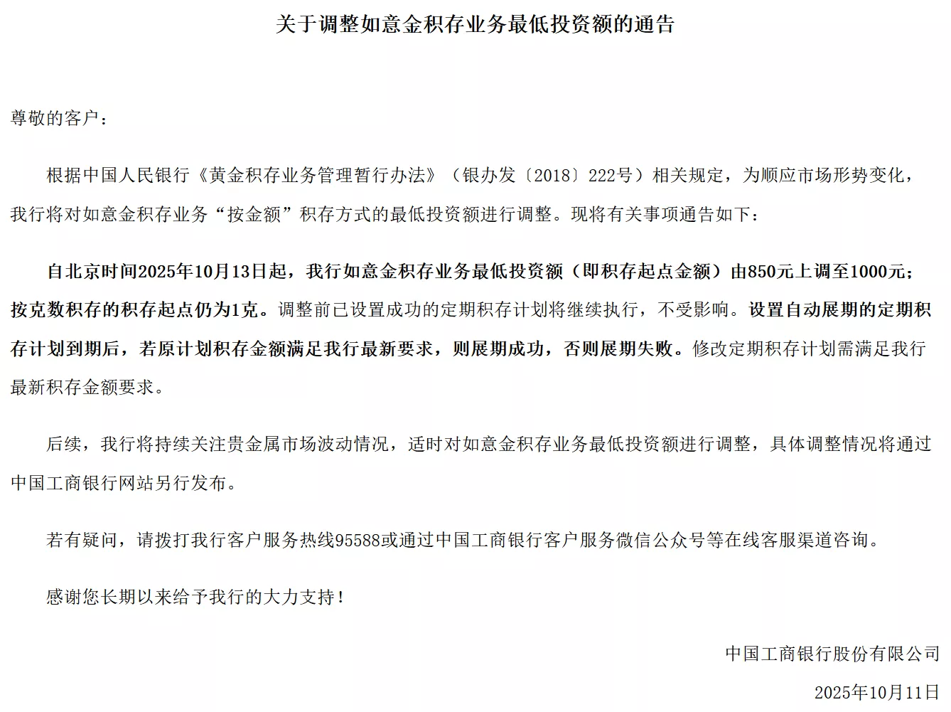 近日,工商银行发布公告称,根据中国人民银行《黄金积存业务管理暂行办法》(银办发〔2018〕222号)相关规定,为顺应市场形势变化,该行将对如意 金积存业务"按金额"积存方式的最低投资额进行调整。现将有关事项通告如下: 自北京时间2025年10月13日起,工商银行如意金积存业务最低投资额(即积存起点金额)由850元上调至1000元;按克数积存的积存起点仍为1克。调整前已 设置成功的定期积存计划将继续执行,不受影响。设置自动展期的定期积存计划到期后,若原计划积存金额满足该行最新要求,则展期成功,否则展期失 败。修改定期积存计划需满足该行最新积存金额要求。 后续,工商银行将持续关注贵金属市场波动情况,适时对如意金积存业务最低投资额进行调整,具体调整情况将通过中国工商银行网站另行发布。 (工商银行) ...
