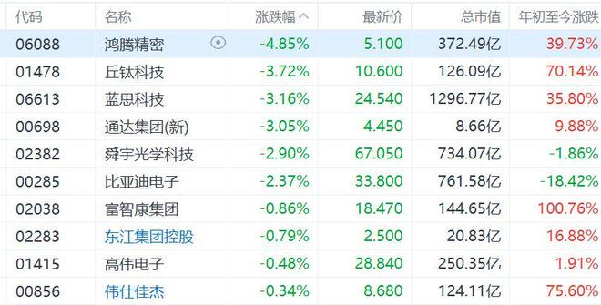 | 代码 | 名称 | | 涨跌幅 ^ | 最新价 | 总市值 | 年初至今涨跌 | | --- | --- | --- | --- | --- | --- | --- | | 06088 | 鸡膳精密 | (0) | -4.85% | 5.100 | 372.49 7 | 39.73% | | 01478 | 丘钛科技 | | -3.72% | 10.600 | 126.09亿 | 70.14% | | 06613 | 蓝思科技 | | -3.16% | 24.540 | 1296.77亿 | 35.80% | | 00698 | 通达集团(新) | | -3.05% | 4.450 | 8.66亿 | 9.88% | | 02382 | 舜宇光学科技 | | -2.90% | 67.050 | 734.07亿 | -1.86% | | 00285 | 比亚迪电子 | | -2.37% | 33.800 | 761.58亿 | -18.42% | | 02038 | 富智康集团 | | -0.86% | 18.470 | 144.65 亿 | 100.76% | | 02283 | 东江集团控股 | | - ...