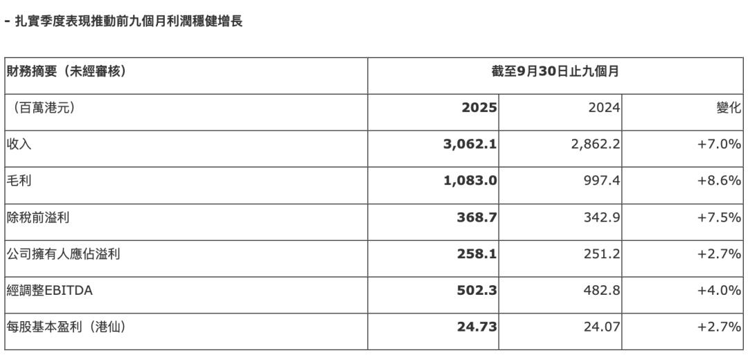Financial Performance - The company reported unaudited consolidated revenue of HKD 3,062,147,000 for the nine months ended September 30, 2025, representing a 6.97% increase from HKD 2,862,173,000 in the same period of 2024[4] - Gross profit for the same period was HKD 1,082,959,000, up from HKD 997,437,000, indicating a growth of 8.56%[4] - The net profit for the nine months ended September 30, 2025, was HKD 262,732,000, compared to HKD 255,492,000 in 2024, reflecting a 2.92% increase[4] - Basic and diluted earnings per share increased to 24.73 HKD cents from 24.07 HKD cents, marking a growth of 2.74%[4] - Adjusted EBITDA increased by 4.0% to HKD 502.3 million, with an adjusted EBITDA margin of 16.4%[19] - The profit attributable to the company's owners was HKD 258.1 million, compared to HKD 251.2 million in the same period of 2024[18] Assets and Equity - Total assets as of September 30, 2025, were HKD 3,960,106,000, compared to HKD 3,833,661,000 as of December 31, 2024, showing an increase of 3.31%[6] - Current assets amounted to HKD 2,504,669,000, up from HKD 2,419,909,000, indicating a growth of 3.52%[5] - The company’s cash and cash equivalents increased to HKD 1,369,718,000 from HKD 1,110,097,000, representing a significant rise of 23.29%[5] - The company’s non-current assets totaled HKD 2,348,501,000, slightly down from HKD 2,356,443,000, reflecting a decrease of 0.34%[5] - The company’s total equity increased to HKD 3,799,902,000 from HKD 3,669,974,000, indicating a growth of 3.54%[6] Revenue Breakdown - Revenue from external customers in Hong Kong and other regions was HKD 1,201.6 million, while revenue from mainland China was HKD 1,860.5 million[15] - The company reported a 5.4% increase in revenue from mainland China, attributed to expanded sales in inland regions and improvements in existing areas[15] - For the three months ended September 30, 2025, net sales to third parties in China reached ¥19,190 million, a 1.0% increase from ¥18,999 million in the same period of 2024[24] - The total revenue for the six months ended September 30, 2025, was ¥37,197 million, slightly up from ¥37,128 million in the same period of 2024, reflecting a growth of 0.2%[24] - The company reported a 5.8% increase in revenue to ¥37,530 million when excluding foreign exchange effects[26] Segment Performance - The company’s operating performance in Hong Kong and other regions showed a segment profit of HKD 98.5 million, while mainland China reported HKD 282.3 million[15] - Operating income for the three months ended September 30, 2025, was ¥2,585 million, an increase of 6.1% compared to ¥2,437 million in the same period of 2024[24] - Core operating profit for the six months ended September 30, 2025, was ¥3,732 million, up 1.1% from ¥3,688 million in the same period of 2024[26] Business Operations - The company is primarily engaged in the production and sale of noodles, cooked foods, frozen foods, beverages, snacks, and vegetables, with operations in Hong Kong and mainland China[7] - The sales of instant noodles in mainland China showed significant growth, particularly for the "合味道大杯麵" and "出前一丁" brands[25] - The acquisition of a Korean snack business and an Australian frozen food company contributed additional revenue to the overall performance of the company[25] - The company continues to expand its distribution channels, leading to increased revenue from instant noodles in other regions[25] Dividend Policy - The company did not recommend any dividend payment for the current period, maintaining a zero dividend for the nine months ended September 30, 2024[14] Cautionary Statements - The company has emphasized the importance of not overly relying on forward-looking statements due to inherent risks and uncertainties[28] - The CEO has urged shareholders and potential investors to exercise caution when trading the company's securities[29]