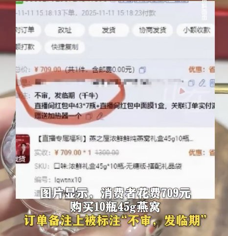目前清仓活动已经结束,仓库没有发临期的产品,"是没有及时关闭备注功能,导致订单也被自动备注 上,目前已经关闭自动备注功能。" 据正在新闻报道,11月11日,福建厦门,消费者反映,在直播间购买燕之屋燕窝,商家后台标注"发临 期"。商家后台图片显示,消费者花费709元购买10瓶45g燕窝,订单备注上被标注"不审,发临期"。 11月12日,燕之屋官方旗舰店客服告诉《正在新闻》,备注是自动备注,之前订单链接做过临期清仓活 动,所以会自动备注上临期。 【#消费者买燕之屋燕窝被备注发临期#,客服回应:自动备注,备注错误】#燕之屋回应给消费者标注 发临期# ...