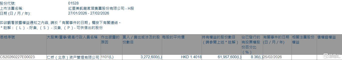 格隆汇2月27日丨根据联交所最新权益披露资料显示,2026年2月25日,红星美凯龙(01528.HK)获仁桥(北京)资产管理有限公司在场内以每股均价1.4018港元 增持327.26万股,涉资约458.75万港元。 增持后,仁桥(北京)资产管理有限公司最新持股数目为6195.76万股,持股比例由7.92%上升至8.36%。 | 表格序號 | 大股東/董事/最高行政人員名稱 作出披露的 買入 / 賣出或涉及的股 每股的平均價 | | 持有權益的股份數目 佔已發行的 有關事 | | --- | --- | --- | --- | | | 農園 份數目 | | (請參閱上述 * 註解 ) 有投票權股 (日 / F | | | | | 份百分比 | | | | | 0/0 | | AND STATES CONSTITUTION CONSULTION CONSULTION CONSULTION CONTRACTION CONTRACTION CONTRACTION OF | | | | | CS20260227E00023 | 仁桥(北京)资产管理有限公司 101(L) 3,272,600(L | HKD 1.4018 ...