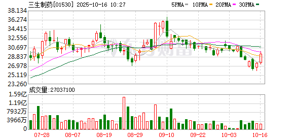 (文章来源:每日经济新闻) 每经AI快讯,10月16日,港股三生制药(01530.HK)盘中涨超8%,截至发稿,涨8.13%,报29.8港元,成 交额5.5亿港元。 ...