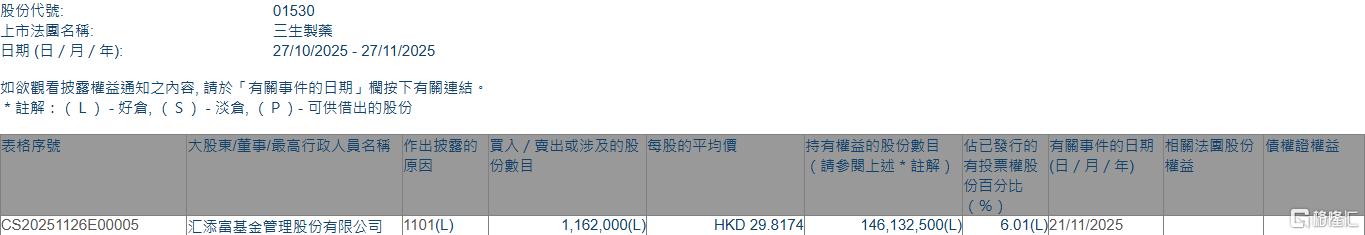 格隆汇11月27日丨根据联交所最新权益披露资料显示,2025年11月21日,三生制药(01530.HK)获汇添富基金管理股份有限公司在场内以每股均价29.8174港 元增持116.2万股,涉资约3464.78万港元。 增持后,汇添富基金管理股份有限公司最新持股数目为146,132,500股,持股比例由5.96%上升至6.01%。 | 表格序號 | 大股東/董事/最高行政人員名稱 作出披露的 買入 / 費出或涉及的股 每股的平均價 | | | | 持有權益的股份數目 佔已發行的 有關事 | | --- | --- | --- | --- | --- | --- | | | 原因 | 份敷目 | | | (請參閱上述*註解) 有投票權股 (日 / 月 | | | | | | | 份百分比 | | | | | | | ( % ) | | CS20251126E00005 | 汇添富基金管理股份有限公司 1101(L) | | 1.162.000(L) | HKD 29.8174 | 146.132.500(L) 6.01(L)21/11/2 | | 股份代號: | 01530 | | --- | --- | | 上 ...