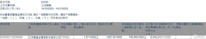 | 表情序长 | 大股票理事 動畫行政人員名 作出技霸的 圓人 / 蒙出或接及的 母版的平均價 | | 持有機量的股份數目 佔已發行的 有關事件的日 相關注體股份優媒證權益 | | --- | --- | --- | --- | | .. 1980 11 | | 投分數目 | 【靖奇卿上班 * 在 | | CARDER CONSULTION CO | | 11 11 21 2 3 2 3 3 3 3 3 3 3 3 3 3 3 3 3 3 3 3 3 3 3 3 3 3 3 3 3 3 3 3 3 3 | STATISTICS COLLECTION OF CLAIMS OF THE FOR CANDRE PORT POST A THE CONSULTION CONSULTI CLASSE | | CS20251113E00042 汇资量基金管理股份有限公司 1101(L) | | 1.471.000(L | HKD 28 4000 146,880,000(L) 6,04(L)10/11/2025 C (r) Michi | 格隆汇11月14日丨根据联交所最新权益披露资料显示,2025年11月10日,三生制药( ...