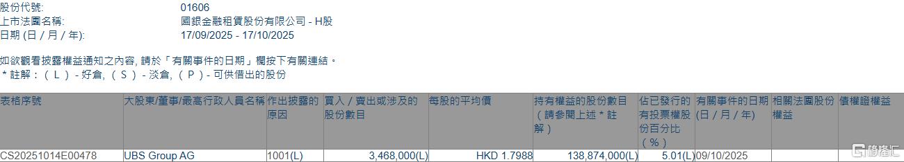 | 股份代號: | 01606 | | --- | --- | | 上市法國名稱: | 國銀金融租賃股份有限公司 - H股 | | 日期 (日 / 月 / 年): | 17/09/2025 - 17/10/2025 | | 表格序號 | 大股東/董事/最高行政人員名稱 作出披露的 買入 / 賣出或涉及的 每股的平均價 | | | | | 持有權益的股份數目 佔已發行的 有關事件的日期 | | | --- | --- | --- | --- | --- | --- | --- | --- | | | | 原因 | 股份數目 | | | 【語参國 拉 * 語 | 有投票權股 (日 / 月 / 年) | | | | | | | | | 份自分比 | | | | | | | | | ( %) | | CS20251014E00478 | UBS Group AG | 1001(L) | | 3,468,000(L) | HKD 1.7988 | 138,874,000(L) | 5.01(L)09/10/2025 | 格隆汇10月17日丨根据联交所最新权益披露资料显示,2025年10月9日,国银金租(01606.HK ...