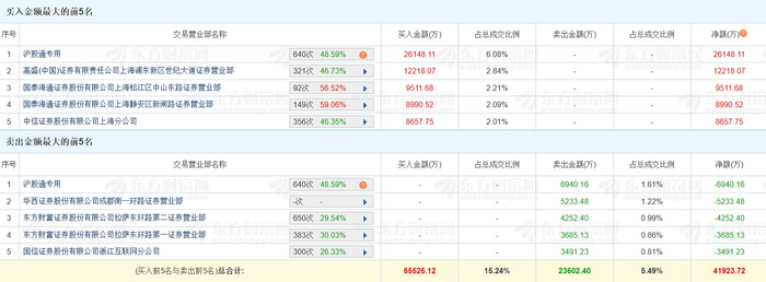 | 英入金额最大的前5名 | | | | | | | | | | --- | --- | --- | --- | --- | --- | --- | --- | --- | | ਖ਼ੇਦੇ | 交易营业部名称 | | | 英入全题(万) | 占总成交比例 | 奥出金额(万) | 品商品公用制 | 净额(万)0 | | 1 绝股通专用 | | 640次 48.59% | 0 | 26148.11 | 6.08% | | | 26148.11 | | 2 高级(中国)证券有限责任公司上海狮东新区世纪大通证券营业部 | | 321次 46.73% | A | 12218.07 | 2.84% | | | 12218.07 | | 3 | 【国泰海通证券股份有限公司上海松江区中山东路运券营业部 | 92次 56 52% | > | 9511.68 | 2.21% | | | 9511.68 | | 4 国泰梅通证券股份有限公司上海静安区新闻路运券营业部 | | 149次 59.06% | b | 8990 22 | 2.09% | | | 8990.52 | | ર | 中信证券股份有限公司上海分公司 | 356次 ...