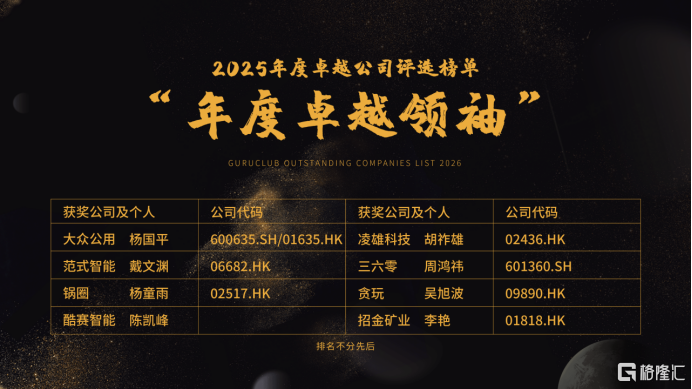 12月22日,格隆汇在线上举办"科技赋能·资本破局"分享会。本次分享会,备受瞩目的卓越公司评选榜 单将隆重揭晓,其中格隆汇"金格奖"年度卓越公司评选中,大众公用(600635.SH/01635.HK)杨国平、范 式智能(06682.HK)戴文渊、锅圈(02517.HK)杨童雨、酷赛智能 陈凯峰、凌雄科技(02436.HK)胡祚雄、 三六零(601360.SH)周鸿祎、贪玩(09890.HK)吴旭波、招金矿业(01818.HK)李艳8位荣获"年度卓越领 袖"奖项。(排名不分先后,按公司首部字母顺序排列) "年度卓越领袖"奖旨在表彰具有出色领导能力、引领企业不断发展壮大的优秀企业领导者。他们如同这 个时代的领航员,以卓越的洞察力、精准的判断和深刻的思想引领各自领域高质量发展,行稳致远。这 些领袖还注重社会责任,关注企业对社会的影响。本次评选通过定量数据分析和专家评审团等方式得出 最终结果。 格隆汇以"全球视野,下注中国"为初衷,本次评选旨在打造出投资圈中最具参考价值的上市公司及独角 兽公司排行榜。此次"金格奖"上市公司评选覆盖港交所、上交所、深交所、纽交所、美国证券交易所、 纳斯达克证券交易所挂牌上市的全部上市公 ...