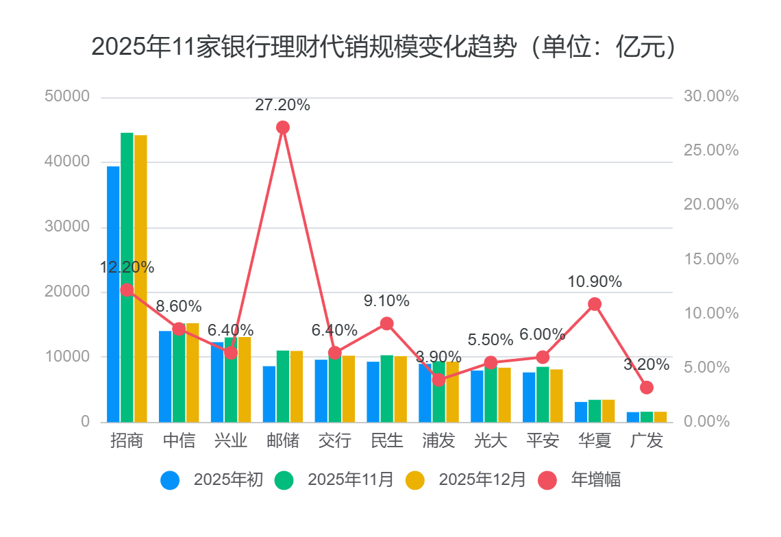 从绝对代销规模上来看,2025年12月,招商银行以4.41万亿元的规模独占鳌头;第二梯队,中信、兴业、邮储、交行、民生规模也在万亿以上,其中中信、 兴业分别达到1.5万亿、1.3万亿的量级,另外三家均在1万亿级别;浦发、光大、平安三家规模接近万亿,分别在8000万到9300万水平;华夏、广发规模较 低,分别为3400万及1600万左右。 11家银行理财代销座次较年初相对稳定,仅邮储银行实现"飞升",超越交行、民生、浦发,由年初的第7位升至年末的第4位。 纳入统计的11家全国性银行共包括2家国有行及9家股份行,分别为:邮储银行、交通银行、招商银行、兴业银行、中信银行、浦发银行、民生银行、光大银 行、平安银行、华夏银行、广发银行。 邮储银行理财代销规模为何劲增? 从单家银行的全年规模增长情况来看,邮储以27.2%的增速"领跑",表现颇为亮眼,在11家全国性银行中稳居第一。此外,招行、华夏2家银行增速也均在 10%以上。 21世纪经济报道记者采访了解到,邮储银行零售理财的高增速,与其近年来在总行层面推进的一系列改革密切相关。邮储银行一位总行人士向记者表示,过 去一年,总行持续扩大理财代销渠道,大力推动零售理财代销业 ...