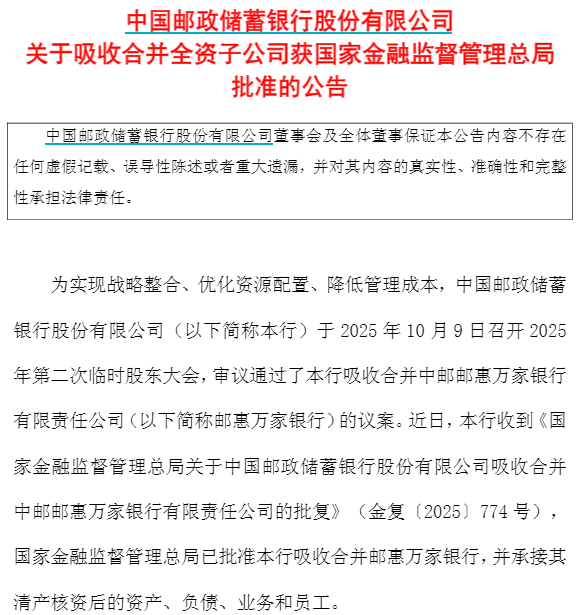 本次吸收合并有助于进一步优化该行管理及业务架构,巩固数字化转型成效,提高运营效率,降低管理 成本。邮惠万家银行为该行全资子公司,其财务报表已按100%比例纳入该行合并报表范围,本次吸收 合并事项不会对该行财务状况和经营成果产生影响,不会损害该行及股东的利益。 邮储银行(601658)(01658)发布公告,近日,该行收到《国家金融监督管理总局关于中国邮政储蓄银 行股份有限公司吸收合并中邮邮惠万家银行有限责任公司的批复》(金复〔2025〕774号),国家金融监 督管理总局已批准该行吸收合并邮惠万家银行,并承接其清产核资后的资产、负债、业务和员工。 ...