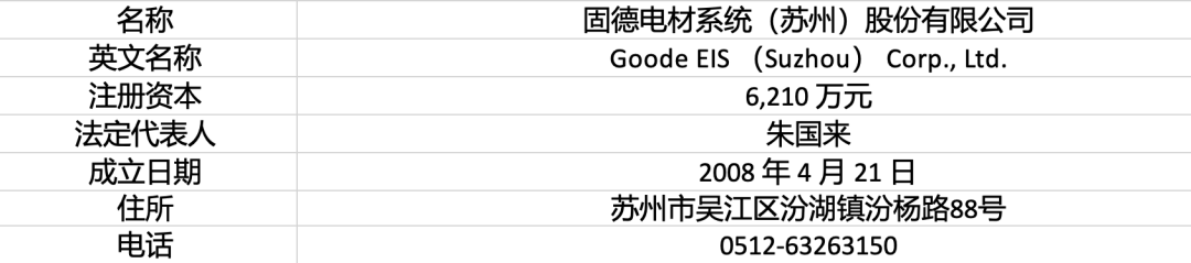一、公司概况 | 名称 | 固德电材系统(苏州) 股份有限公司 | | --- | --- | | 英文名称 | Goode EIS (Suzhou) Corp., Ltd. | | 注册资本 | 6,210 万元 | | 法定代表人 | 朱国来 | | 成立日期 | 2008 年 4 月 21 日 | | 住所 | 苏州市吴江区汾湖镇汾杨路88号 | | 电话 | 0512-63263150 | 二、主营业务 公司专注于新能源汽车动力电池热失控防护零部件及电力电工绝缘产品的研发、生产和销售,为客户提供定制化的热失控防护解决方案和电力电工高性能 绝缘解决方案。新能源汽车动力电池热失控防护零部件以云母、高性能树脂为核心基础材料制成,可复合超级棉、气凝胶等材料增强隔热性能,产品覆盖 电芯、模组、电池包等各层级的热失控防护;电力电工绝缘产品涵盖绝缘树脂、云母制品、柔性及刚性类复合材料和绝缘结构件等,可精准满足电力发 电、输配电尤其是特高压领域的严苛绝缘需求。 公司致力于成为全球领先的新能源汽车动力电池热失控防护零部件及方案的提供商,依托在电力电工绝缘领域积累的云母材料相关核心技术和树脂调配工 艺,创新性地实现了从电 ...