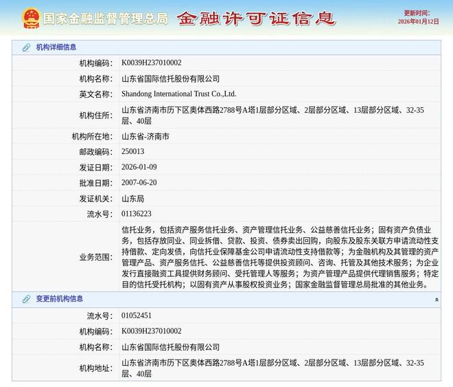 1月12日,根据国家金融监管总局许可证信息查询平台,山东省国际信托股份有限公司换发金融许可 证,发证日期2026年1月9日。 新证信息显示,山东省国际信托股份有限公司住所位于山东省济南市历下区奥体西路2788号A塔1层部 分区域、2层部分区域、13层部分区域、32-35层、40层。批准设立日期为2007年6月20日,机构编码 K0039H237010002,业务范围包括:信托业务,包括资产服务信托业务、资产管理信托业务、公益慈善 信托业务;固有资产负债业务,包括存放同业、同业拆借、贷款、投资、债券卖出回购,向股东及股东 关联方申请流动性支持借款、定向发债,向信托业保障基金公司申请流动性支持借款等;为金融机构及 其管理的资产管理产品、资产服务信托、公益慈善信托等提供投资顾问、咨询、托管及其他技术服务; 为企业发行直接融资工具提供财务顾问、受托管理人等服务;为资产管理产品提供代理销售服务;特定 目的信托受托机构;以固有资产从事股权投资业务;国家金融监督管理总局批准的其他业务。 根据《银行保险机构许可证管理办法》规定,许可证载明机构编码、机构名称、业务范围、批准日期、 机构住所等信息,许可证记载事项发生变更的,银行 ...