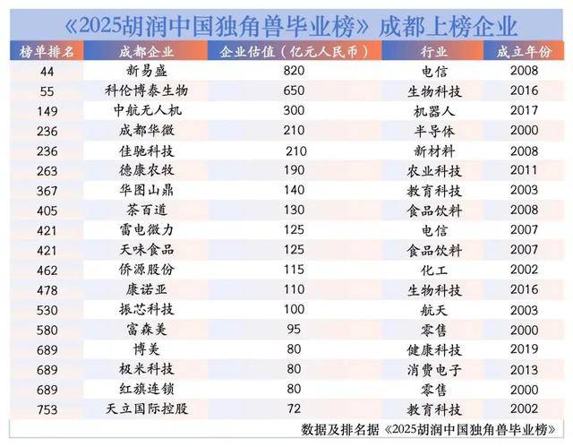 1月18日,记者从胡润研究院首次发布的《2025胡润中国独角兽毕业榜》获悉,该榜单列出了中国独角 兽"毕业生",即成立于2000年之后、价值10亿美元以上的上市公司。全国共有796家企业上榜,其中, 成都上榜企业有18家,企业数量位居全国第七。 胡润表示,发布此榜单希望能够回应部分城市因本地在榜独角兽数量偏少产生的焦虑。部分城市看似在 榜独角兽数量不多,实际原因之一是其培育的独角兽企业已批量实现上市毕业,"796家独角兽'毕业 生'中,有33家企业价值已超过1000亿元,其中3家企业价值已超过1万亿元"。 据介绍,大城市对优质企业及人才的磁吸效应正持续凸显。在创造千亿级价值的独角兽及独角兽"毕业 生"的创始人中,三分之二并未选择在成长地创业,而是被创新创业生态建设领先的大城市所吸引。"这 一趋势也提醒,地方政府亟须构建高效完善的创新创业生态,否则或将在区域竞争中面临发展压 力。"胡润称,目前中国创新创业生态最好的城市中,上海、北京稳居头部阵营,"值得关注的是,成 都、长沙、无锡、西安等城市表现亮眼。" 榜单显示,成都共有18家企业跻身《2025胡润中国独角兽毕业榜》—— | | | 《2025胡润中国独角兽毕 ...