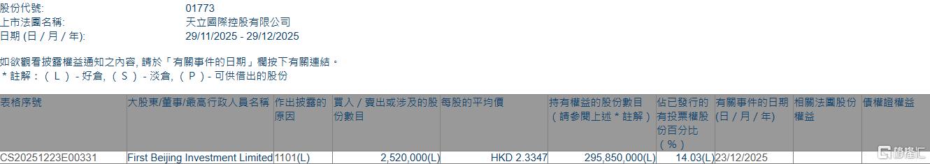 格隆汇12月29日丨根据联交所最新权益披露资料显示,2025年12月23日,天立国际控股(01773.HK)获First Beijing Investment Limited在场内以每股均价2.3347 港元增持252万股,涉资约588.34万港元。 增持后,First Beijing Investment Limited最新持股数目为295,850,000股,持股比例由13.91%上升至14.03%。 | 股份代號: | 01773 | | --- | --- | | 上市法國名稱: | 天立國際控股有限公司 | | 日期 (日 / 月 / 年): | 29/11/2025 - 29/12/2025 | | 表格序號 | 大股東/董事/最高行政人員名稱 作出披露的 買入 / 費出或涉及的股 每股的平均價 | | | 持有權益的股份數目 佔已發行的 有關事件的 | | --- | --- | --- | --- | --- | | | 原因 份數目 | | | (請參閱上述*註解)有投票權股 (日 / 月 / 年 | | | | | | 份百分比 | | CS20251223E00331 | First Be ...