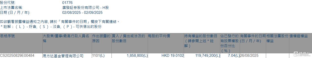 广发证券(01776.HK)获易方达基金增持185.88万股