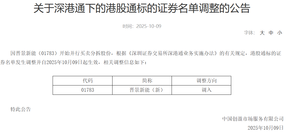 10月09日,深交所发布公告称,因晋景新能(01783)开始并行买卖分拆股份,根据《深圳证券交易所深港通业务实施办法》的有关规定,港股通标的证券名 单发生调整并自2025年10月09日起生效,调入晋景新能(新)。 | 代码 | 简称 | 调整方向 | | --- | --- | --- | | 01783 | 晋景新能(新) | 调入 | ...