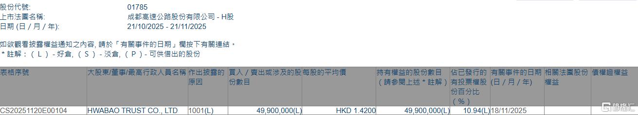格隆汇11月21日丨根据联交所最新权益披露资料显示,2025年11月18日,成都高速(01785.HK)获HWABAO TRUST CO., LTD在场内以每股均价1.42港元增持 4990万股,涉资约7085.8万港元。 增持后,HWABAO TRUST CO., LTD最新持股数目为4990万股,持股比例为10.94%。 | 表格序號 | 大股東/董事/最高行政人員名稱 作出披露的 買入 / 賣出或涉及的股每股的平均價 | | | 持有權益的股份數目 佔已發行的 有關事件的日 | | | --- | --- | --- | --- | --- | --- | | | 原因 份數信 | | | (請參閱上述*註解)有投票權股(日/月/年) | | | | | | | 分目分比 | | | Company of the CS20251120E00104 | HWABAO TRUST CO., LTD (1001(L) | 49.900.000(I | HKD 1.4200 | 49.900.000(L) | 10.94(L)18/11/2025 | | 股份代號: | 01785 | | --- | --- ...
