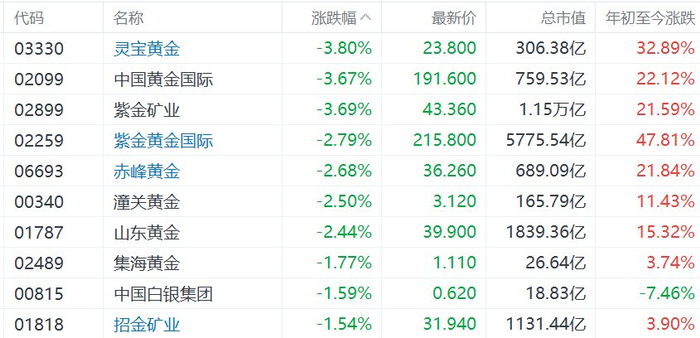 昨晚午夜突如其来的跌势伴随着华尔街的恐慌情绪,因投资者担忧人工智能对企业盈利的影响,各类资 产价格均出现回落。策略师Michael Ball表示,金价的剧烈回撤并没有明确的催化剂,这很可能是受到 商品交易顾问(CTA)利用计算机模型押注价格走势所引发的抛售而加剧。投资者目前正关注周五晚些时 候公布的美国通胀数据,该数据可能决定市场对美联储下一步行动的预期。本周公布的1月就业数据十 分强劲,降低了美联储在年中再次降息的紧迫性。 | 代码 | 名称 | 涨跌幅 ^ | 最新价 | 总市值 | 年初至今涨跌 | | --- | --- | --- | --- | --- | --- | | 03330 | 灵宝黄金 | -3.80% | 23.800 | 306.38亿 | 32.89% | | 02099 | 中国黄金国际 | -3.67% | 191.600 | 759.53亿 | 22.12% | | 02899 | 紫金矿业 | -3.69% | 43.360 | 1.15万亿 | 21.59% | | 02259 | 紫金黄金国际 | -2.79% | 215.800 | 5775.54 Z | 47.8 ...