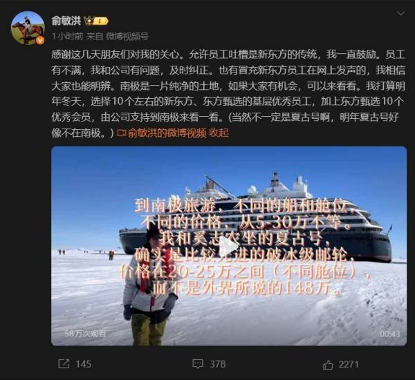 记者丨黎雨桐 编辑丨曾静娇 视频丨许婷婷 见习编辑 陈泽锴 11月20日,新东方董事长俞敏洪在社交平台发文,辟谣"到南极坐邮轮花148万":到南极旅游,不同的 船和舱位,不同的价格,从5-30万不等,我和奚志农坐的夏古号,确实是比较先进的破冰级邮轮,12天 价格在20-25万之间(不同舱位),而不是外界所说的148万。 俞敏洪还在评论区回应:感谢这几天朋友们对我的关心。允许员工吐槽是新东方的传统,我一直鼓励。 员工有不满,我和公司有问题,及时纠正。也有冒充新东方员工在网上发声的,我相信大家也能明辨。 南极是一片纯净的土地,如果大家有机会,可以来看看。我打算明年冬天,选择10个左右的新东方、东 方甄选的基层优秀员工,加上东方甄选10个优秀会员,由公司支持到南极来看一看。(当然不一定是夏 古号啊,明年夏古号好像不在南极。) 然而这封饱含"南极感悟"的信函并未收获预期的共鸣,有员工在社交媒体暗指老板的"远方"与员工 的"现场"形成鲜明对比。更直白的吐槽来自企业邮箱留言称,看到信中对南极风光的描述"只觉得讽 刺"。 11月18日晚,俞敏洪在社交平台发布视频疑似回应争议。 视频依然是其南极之旅的画面,不过其在画面中配文 ...